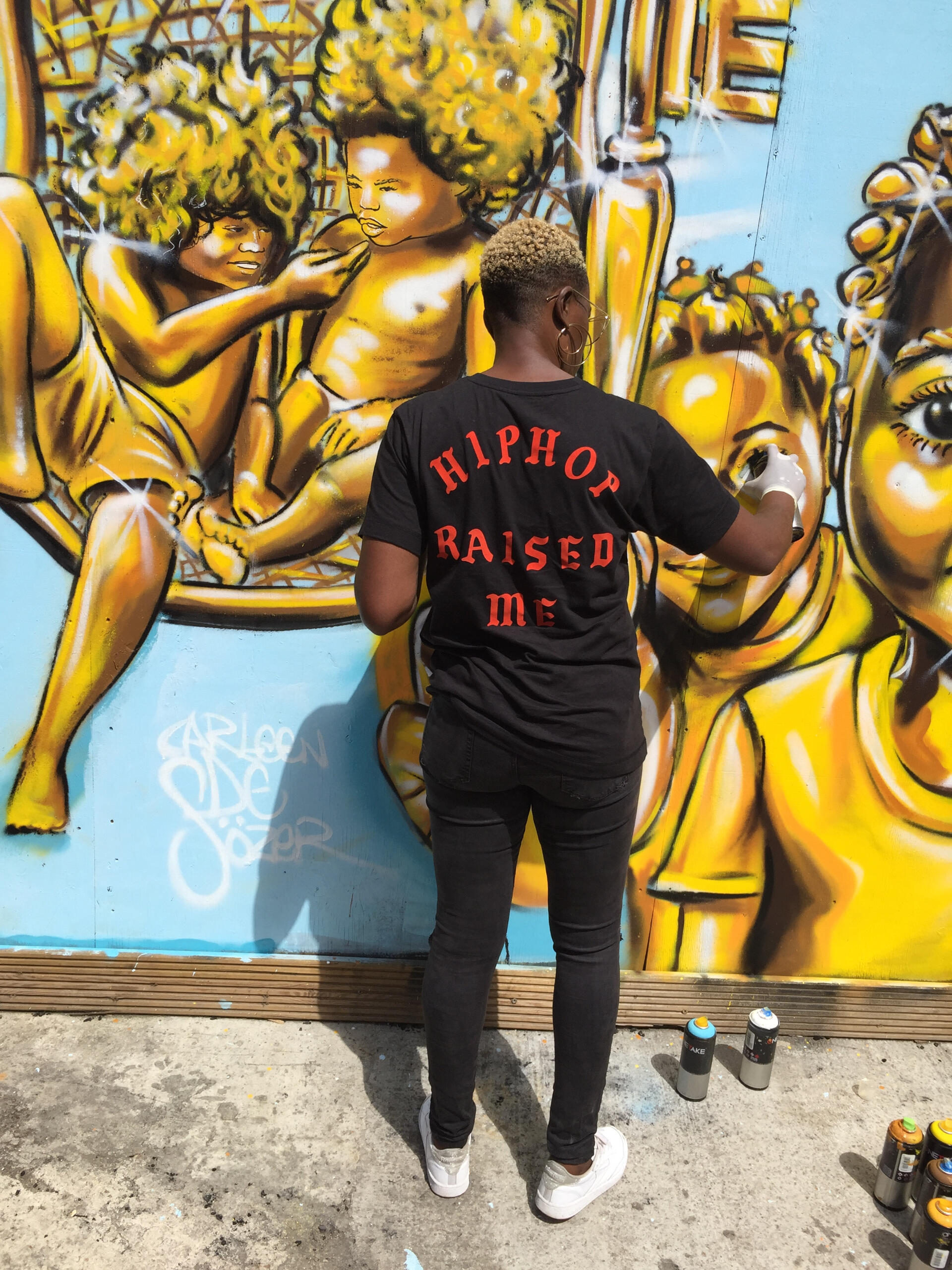 Carleen De Sözer is widely regarded as one of London’s most skilled and diverse aerosol and airbrush artists. She has found a place on the International street art scene with her highly appealing Afrocentric, Afrofuturistic and often golden paintings. Carleen’s distinct work can be seen all across England.Producing large Murals all around London, has exposed Carleen’s work and personality to street art lovers worldwide. Carleen has a strong passion for creating spaces for other artist to be seen, curating and co-curating a number of exhibitions and having the pleasure to be invited by Tate Britain to curate a Late at Tate: Freedom Frequencies and also be in invited by LSE to exhibit and curate an exhibition Climate Change: America and the World.Over the last 20 years, Carleen has been consistent in supplying art in many formats, from graphic design, tattooing to airbrushing, from logos to CD covers, from canvas to walls, from t-shirt designs to to curating exhibitions to putting on art events and teaching her skills to the youth… it’s fair to say that Carleen is an artist that chose her passion as her job. Ask her what she does for a living and she’ll comfortable state “I supply art for a living”.